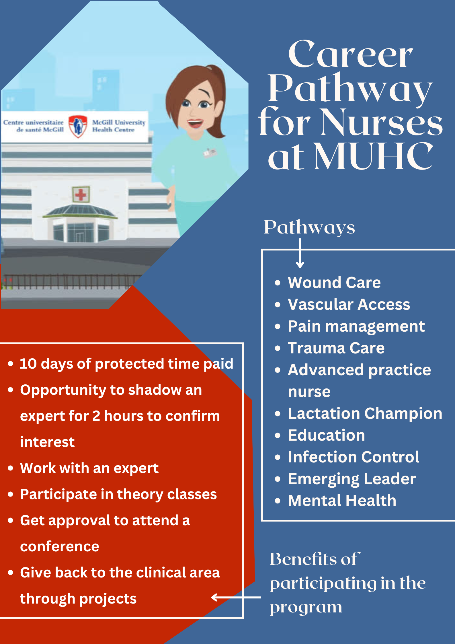 • Career Pathways: Support the professional development of experienced nurses (2 years and more) who want to explore new roles in nursing care. Offering 10 specialized pathways, they encourage the development of clinical skills, autonomy and engagement.