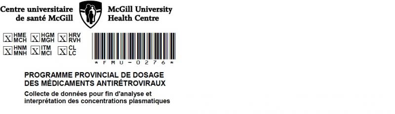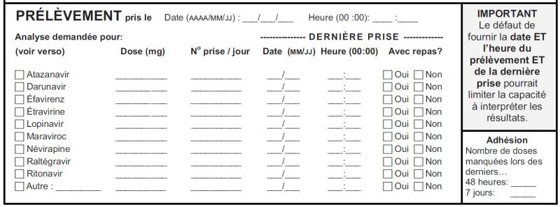Nous vous demandons de fournir les informations requises pour identifier le patient en haut à droite du formulaire (nom du patient, numéro de dossier médical, date de naissance, sexe, numéro d'assurance maladie). Cette information est nécessaire pour identifier le rapport qui sera envoyé au médecin. L'âge du patient permettra l'individualisation de l'interprétation, particulièrement en pédiatrie. Toute l'information demeurera confidentielle et sera seulement consultée par le personnel du Programme provincial de dosage des médicaments antirétroviraux. [/collapsed]