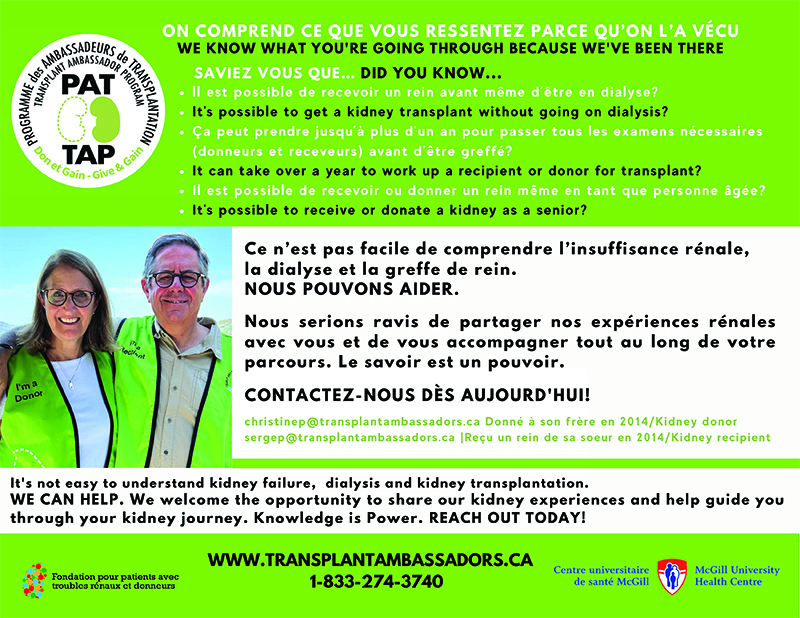 Already well established in Ontario’s healthcare system, the program is being launched for the first time in Quebec, starting at the Montreal General Hospital. TAP connects patients with chronic kidney disease and their families to mentors (ambassadors) who have personally experienced a kidney donation or transplant.