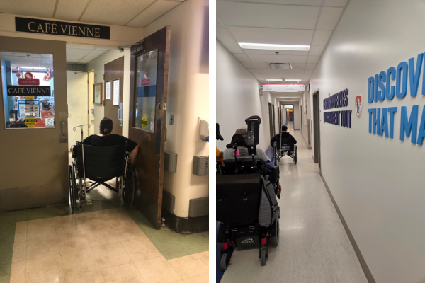 At The Neuro, Librarian Sabrina Burr faced different challenges in the older building. Tight door frames, difficult floor transitions, a steep ramp and narrow turning spaces made simple movements hard. Sabrina and Viola Grasso, Coordinator of Administrative Services, who also participated in the activity, are reflecting on their experiences to help improve wheelchair accessibility at The Neuro.