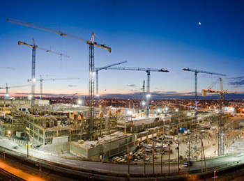 Sur le Site Glen, les travaux progressent rapidement. Outre les grues, on aperçoit très nettement une structure et il devient facile d'imaginer de quoi aura l'air le Site Glen, une fois achevé.